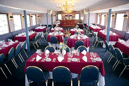 seats 80 to 100 guests for San Francisco dinner cruises while the upper deck accommodates 60 to 70 guests for an SF dining cruise.