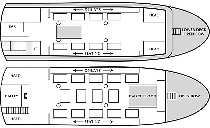 seats 80 to 100 guests for San Francisco dinner cruises while the upper deck accommodates 60 to 70 guests for an SF dining cruise.